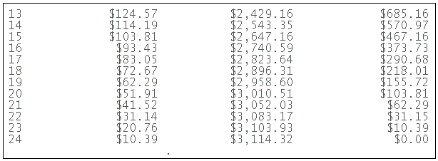 Some lenders use the Rule of 78 to arrive at the interest portion of a loan payment. The rule of 78 takes the total interest for a loan and apportions excessive interest to the early payments as compared to an amortization schedule. If the lender uses conventional calculations to arrive at the total interest for the loan but uses the rule of 78 to apportion the total interest cost over the life of the loan then do not take out a lengthy loan and pay it off early. The example below will illustrate the point. A simple example of $24,000 at 12% with monthly compounding, amortized for two years (24 monthly payments). An annual interest rate of 12% is purposely chosen because most people can do the very first monthly interest calculation in their head. 12% a year with monthly compounding is 1% per month. Thus after one month the interest for $24,000 is $240 (see the green cell below, 1% which is 0.01 thus .01 x $24,000 = $240). The rule of 78 will use the same total interest of $3,114.32 however it apportions $249.15 to the very first payment. A traditional amortization schedule apportions $240, the correct amount to the first payment. RULE of 78 Interest allocated over 24 payments is shown below (white background). If the loan was paid back as $24,000 plus the $3,114.32 over 24 even payments of $1,129.76 there would be no problem. The problem arises when you pay the loan off early as in after 12 months. After 12 months using a conventional amortization schedule, the balance owing after the 12th payment is $12,715.57 and the accumulated interest paid during those 12 months is $2,272.73 Using the rule of 78 method the accumulated interest paid during those 12 months is $2,304.59 which is $31.86 more in interest. The difference becomes more pronounced as the amortization period and the loan amount increases. For example, on a loan of $100,000 amortized for 4 years at 12% with monthly compounding the difference in accumulated interest paid after one year is $564.82 which is no small change. Scenarios such as this can be avoided by asking for an amortization schedule. Once you look at the breakdown of the very first monthly payment you know where you stand. "an amortization schedule, .. don't take a loan without one"