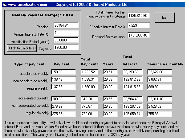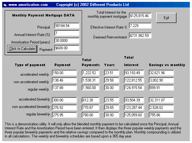 BACK TO THE WEEKLY PAYMENT MORTGAGE If you required a 30 year mortgage of $90,184.54 and the interest rates were 7% and the lender was using monthly compounding, the monthly payments would be $600 for the next 30 years (assuming the rate is 7% over the 30 years). If you were experienced at using a financial calculator you could calculate the weekly payment required to amortize the $90,184.54 at 7%, monthly compounding, over the next 30 years. The weekly payment would be $137.88 for the next 30 years. This regular weekly payment is the value that is derived from any financial calculator. In 1984 the first Canadian lender to offer a weekly payment mortgage also offered variations in the payment amount. This lender arbitrarily coined two weekly payment terms, non accelerated weekly and accelerated weekly. The regular monthly payment based upon the full amortization period of 30 years is calculated and used as the reference point. In this example, $600 per month. The non accelerated weekly is the yearly cash flow based upon twelve $600 monthly payment divided by 52 payments (600 x 12/52). The accelerated weekly is the yearly cash flow based upon thirteen $600 monthly payment divided by 52 payments (600 x 13/52). None of the financial calculators will directly calculate these two weekly payments because they have nothing to do with the amortization formulas. The screen below shows the difference in savings due to the 3 types of weekly payments. Follow this procedure and you cannot go wrong! Always ask your lender to calculate the monthly payment first ($600). Divide it by four (13/52=1/4) for the accelerated weekly. Divide it by 4.3333 (12/52 = 4 1/3)for the non accelerated. The regular weekly payment (as per the calculator) of $137.88 save you $899.92 over the full amortization period of 30 years. The non accelerated weekly saves you $3,002.91 over the 29.58 years. This is called free money! $138.46 taken out of your chequing account each week is the same yearly cash flow as $600 a month being taken out of your chequing account. You save $3,002.91 over the next 29.58 years for doing nothing. The lender has taken the same total amount of money from your account at the end of the year the only difference is the lender takes it out weekly. The accelerated weekly of $150 saves you $32,622 over the next 23.51 years because it is more frequent and a larger payment. In fact the bigger you make the weekly payment the more you save and the faster you pay off the loan (the amortization period becomes smaller). In this example, if you increased the weekly payment to $200 the mortgage would be paid off in 13.3 years and you would save $77,594 compared to the regular monthly payment of $600. The above explanation is 100% applicable for both American and Canadian mortgages. The only difference between an American and a Canadian mortgage is American lenders use monthly compounding and Canadian lenders use semi-annual compounding. The difference in compounding effects only the value of the interest factor used to calculate the interest due at the end of each payment period. All the algebraic equations are identical. Anyone that tells you differently is wrongly informed or lying. Canadian mortgages traditionally are amortized for 25 years, whereas American mortgages are usually amortized for 30 years. You can ask for a smaller amortization period however, the salary qualifications usually force most people to chose a 25 or 30 year amortization period. Some lenders in the USA are starting to offer biweekly payment mortgages. At low interest rates the $300 accelerated biweekly payment plan saves you $32,311.07 almost as much as a the $150 accelerated weekly payment plan which saves you $32,621.96 as can be see from the screen capture below. Use any of the MORTGAGE2 software programs (or ask an accountant) to verify the biweekly payment schedule before signing on the dotted line. Ask for an amortization schedule, don't leave the Bank without one. If your lender cannot or will not provide you with an amortization schedule, then change lenders. Click on, more information, if you require further justification for having an amortization schedule. For new home buyers, never, never skip payments early on in the mortgage. Some lenders allow new home owners to skip, for example, the first three monthly payments, in order to help them buy a new stove and fridge. Don't do it and here is why! In this day and age of computers and software there is absolutely no excuse for any lender not being able to provide an amortization schedule to a borrower.