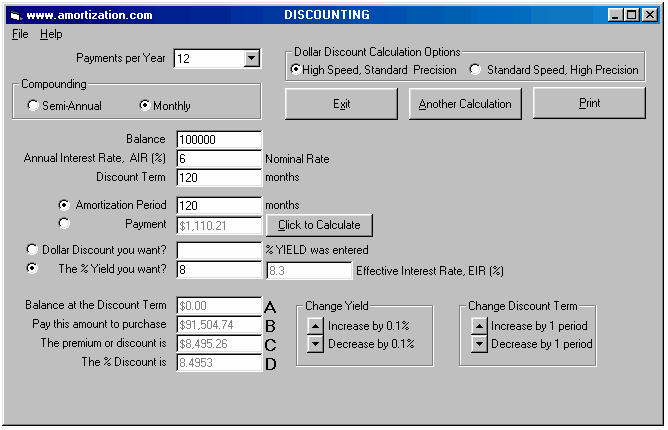 A Broker arranges for a Lender to hand you a cheque for $45,000 and you hand your Broker a cheque for $3,500 to cover the cost of his total fees. The blended monthly payments (principal and interest) for a loan of $45,000 are $464.35 based on an annual interest rate of 12% with semi-annual compounding and amortized for 25 years. Using the MORTGAGE2 software you can see that the interest for the very first payment is $439.15 per month. With this interest only loan, the borrower is actually receiving $41,500 but is making interest only, monthly payments of $439.15 for the next 36 months based on a loan of $45,000. Using the DISCOUNTING software the TCOB is calculated as follows. Certain combinations of computers and operating systems will not let you enter the exact interest in the Payment box for an interest only. Just add .001 to the payment ( in this example $439.151) in order to get by this quirk. The payment will still come back as 439.15 and the two interest rates are still correct at two decimal places. The new interest rate due to the brokers total fees is 15.417% which translates into an effective interest rate of 16.0112 % due to semi-annual compounding. Thus the TCOB is 16.01 % at two decimal places, for $3,500 fees, using the Standard Speed High Precision. It is recommended to use the High Precision setting for all calculations unless you have a really slow computer. UNDERSTANDING THE DISCOUNTING PROGRAM: