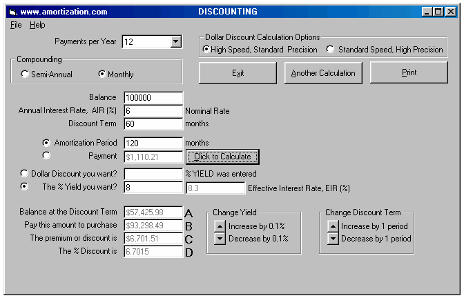 *** READ ME FIRST BEFORE YOU CONTINUE *** TCOB over the entire Amortization Period Calculating YIELDS on a Discounted Mortgage TCOB over the entire Amortization Period A Broker arranges for a Lender to hand you a cheque for $45,000 and you hand your Broker a cheque for $3,500 to cover the cost of the total fees. The blended monthly payments (principal and interest) for a loan of $45,000 are $464.35 based on an annual interest rate of 12% with semi-annual compounding and amortized for 25 years. If the borrower is making payments for the next twenty five years based upon a 12% rate (constant 12% rate for the twenty five years) what is the impact of the total fees of $3,500? 1.. Set the Dollar Discount Calculation Option to Standard Speed High Precision. It is always recommended to use this setting unless your computer is really slow. The new interest rate due to the impact of the total fees is 13.233 % which translates into an effective interest rate of 13.6708 % due to semi-annual compounding. Thus the TCOB is 13.67 % at two decimal places. It is interesting to note that the American, Truth in Lending legislation would have the value of 13.23% quoted as the APR, rather than quoting the new EIR as in Ontario, Canada. This TCOB calculation could also have been handled by the MORTGAGE2 PRO program as follows; This is the same loan information in the CALCULATOR. Subtract the total fees of $3,500 from the principal and recalculate the annual Interest Rate as shown below; The new EIR because of the total fees is 13.670034 thus the TCOB is 13.67% at two decimal places. The logic is that you are making 300 payments based upon a $45,000 loan but in effect you only really have $41,500 thus the interest must be higher.
