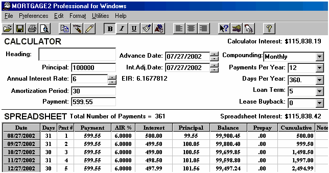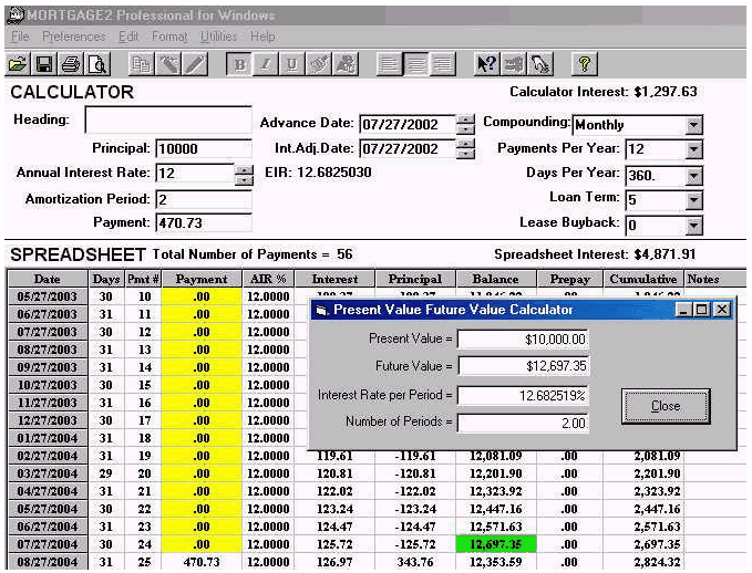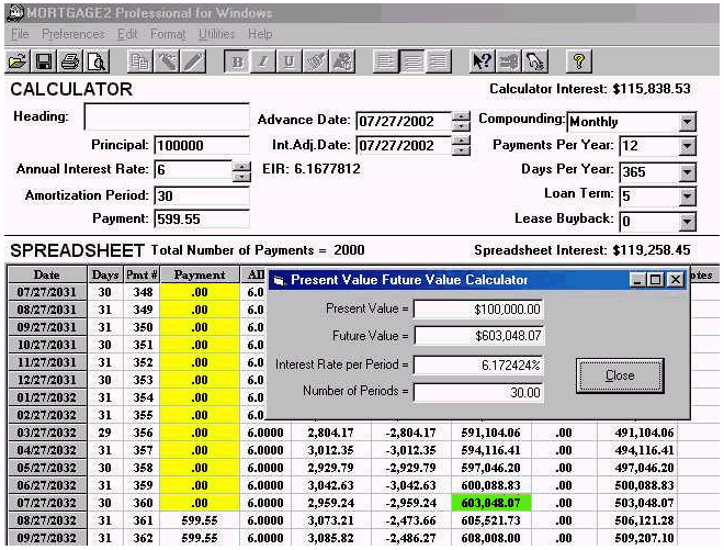 The Truth in Lending legislation in the USA in some instances could be appropriately called the Truth in Lying legislation, because it does not properly address some mortgage issues! The following example will illustrate the point. If you borrowed $100,000 at an annual interest rate of 6% with monthly compounding for 30 years the monthly payments would be $599.55 The effective interest rate (EIR), because of monthly compounding, would be 6.1677812%. The EIR shows the lender how much money he makes each year by reinvesting each monthly payment, at the same interest rate, as it is received. If you borrowed $10,000 at 12% for two years, how much would the lender make at the end of two years? The EIR is 12.6825%, after one year the lender makes; 10,000 x 1.126825 = $11,268.25 and after two years the lender makes $11,268.25 x 1.126825 = $12,697.34 which is within a penny of the negative amortization schedule below. The balance at the start of each year multiplied by 1+EIR/100 shows the lender what the investment is worth at the end of the year. You can now appreciate the significance of the EIR, lets get back to the initial $100,000 mortgage example. Just to reiterate, the example screen below shows the EIR via the Present Value Future Value window, the negative amortization schedule in the SPREADSHEET and the CALCULATOR, .. all agree with an EIR of 6.16778% The total interest paid (Cumulative) by the borrower to the lender is $502,257.68 over the 30 years. QUESTION: If your lender used a 365 day year, exact day, monthly payment schedule, would you know that the EIR was greater compared to the "Bankers Year" schedule which is based upon a 360 day year??? If you had an amortization schedule you would know that you paid your lender an EXTRA $790.39 in interest over the 30 years. The EIR for a 365 day year schedule will not show up on any Financial Calculator. By changing the days per year to 365, then doing a negative amortization schedule in the SPREADSHEET, then using the accumulated value of $603,048.07 to plug into the Present Value Future Value window you can determine that the actual EIR is 6.172424% not 6.167781 as any standard financial calculator would show. Generally one converts Canadian per capita information to American per capita information by multiplying by a factor of 10 as the USA has approximately ten times the population. If the USA residential mortgage market is approximately tens times the Canadian market then there is 4 trillion dollars lent out each year in the USA for residential mortgages. 6.1724% - 6.1678% = .0046% .000046 x 4,000,000,000,000 = 184,000,000 American homeowners/borrowers could be paying as much as an extra 184 million dollars in interest each year and and not be aware!!! That is a tremendous price to pay for not knowing the facts!!