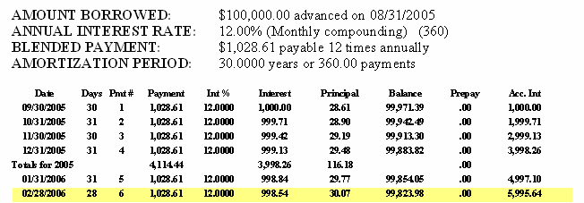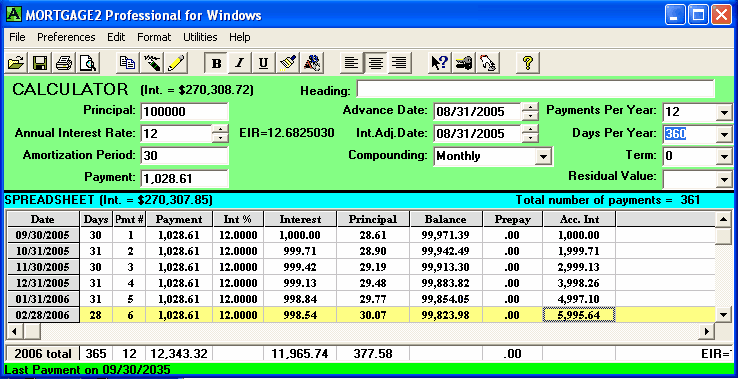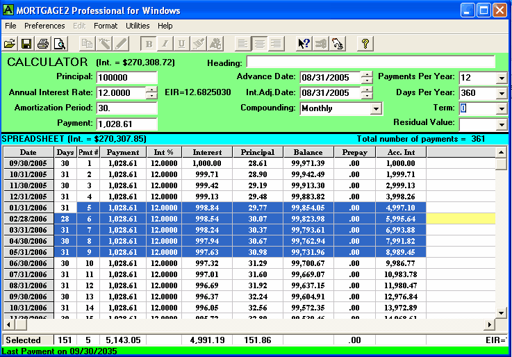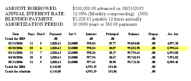 Below is the main CALCULATOR/SPREADSHEET screen that always appears with default information in the CALCULATOR and a SPREADSHEET based upon the default information (you can change the default info to anything you like). If you want to print the entire SPREADSHEET then click, File, Print, Spreadsheet and the printed schedule (only part of a schedule is shown) will appear as shown below. If you wanted to print just a portion of the SPREADSHEET then, highlight that portion of the SPREADSHEET with your mouse and then click, File, Print, Highlighted Range